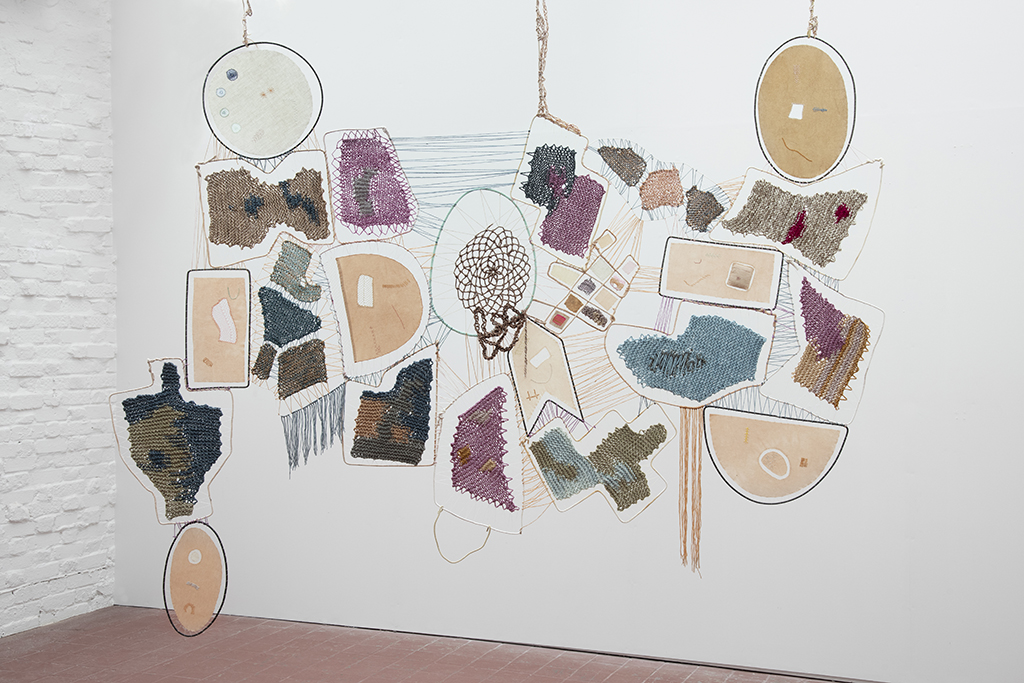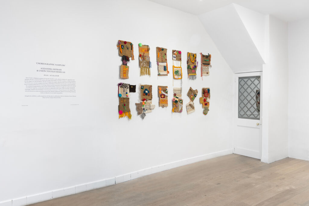 Choreographic Samplers brings together a selection of recent works by Argentinian artist Alejandra Mizrahi, including individual works and collaborations with Unión Textiles Semillas. For several years, dechados (samplers) have become a central textile device in Mizrahi’s practice, not only as material expression but as a working method. Samplers, as prompts for practice and learning, evolved from functional objects created by women into historical archives, where patterns, motifs, and stitched words unravel ways of knowing, oftentimes outside formal education and canonical art narratives.