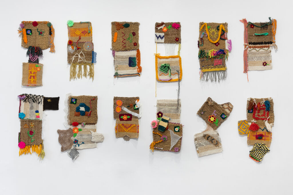 Unión Textiles Semillas. Quepi | Atado mágico, 2024. 12 knitted pieces; standing looms, backstrap looms, and frame looms; needle lace, interlaced work, and embroidery, made with llama fiber, sheep’s wool, chaguar, cotton, and industrial yarns. The yarns are dyed with natural dyes: rhubarb, algarrobo sap (‘lloro de algarrobo’), walnut, eucalyptus, yerba, onion, chinchilla, cochineal, beetroot, jarilla, and wild herbs, as well as with artificial dyes. Image: Studio AURA