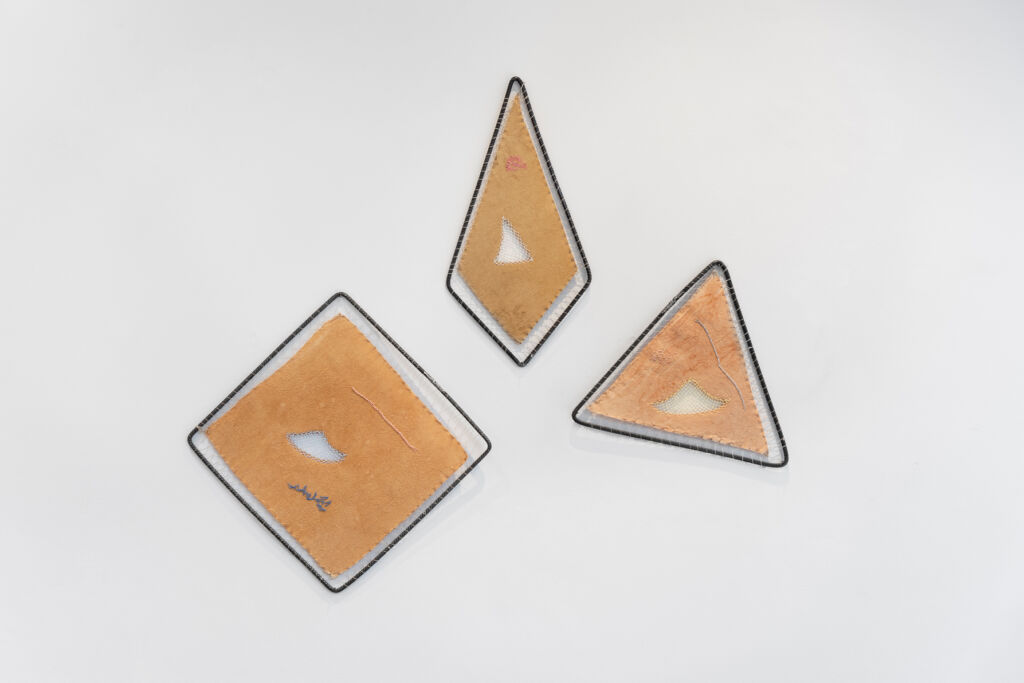 Left to right: 3 (de la serie Coplas), 2025 Natural dyes, two-needle knitting, felt, lace edgings and embroidery; Sin título 2 (de la serie Fantasía aplicada) 2022. Cotton fabric dyed with natural dyes, embroidery and lace edging; 4 (de la serie Coplas), 2025 Natural dyes, two-needle knitting, felt, lace edgings and embroidery. Image: Studio AURA