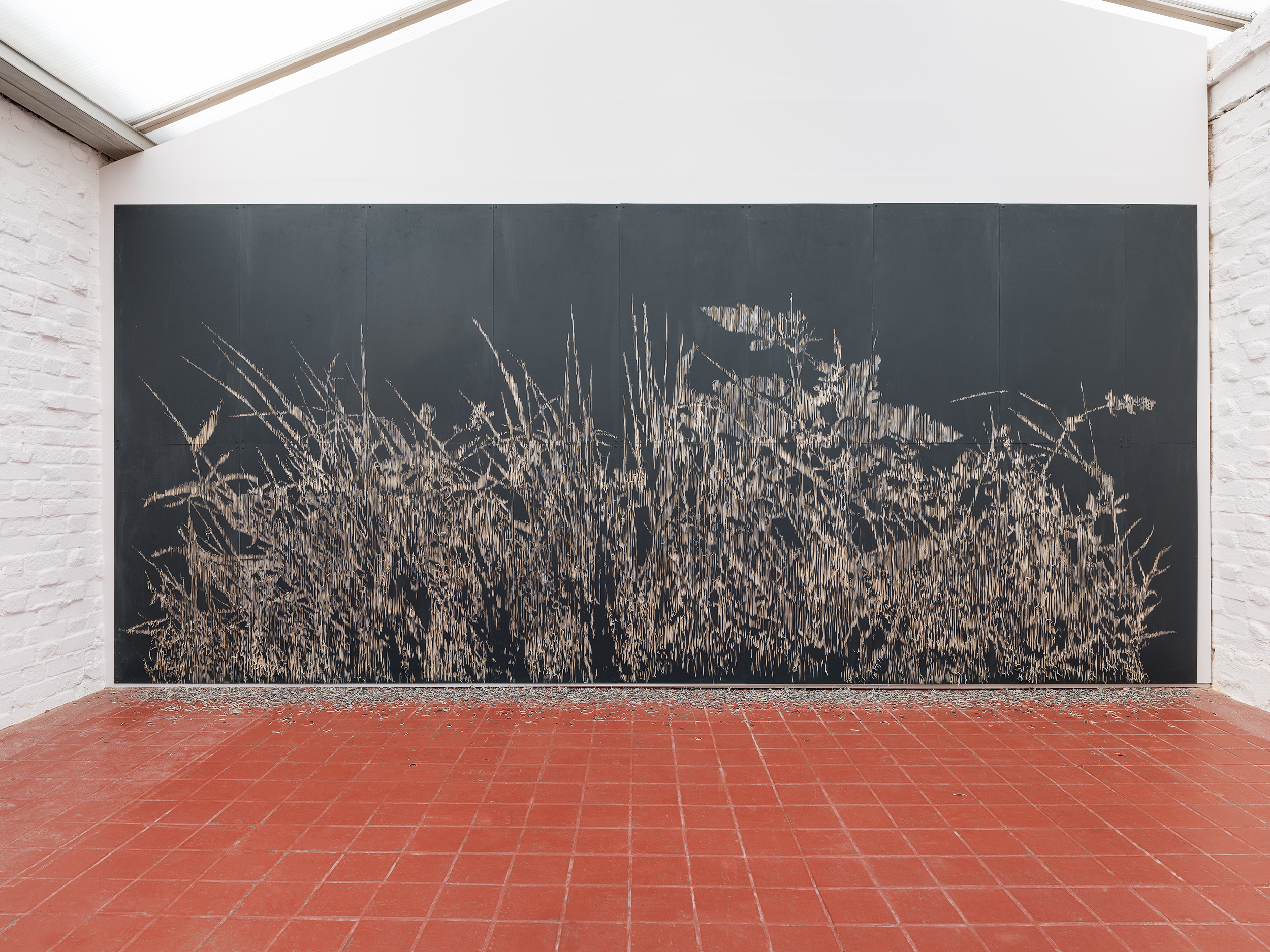 Tozer formed composite images of weeds and carved them into false walls, the dimensions of which directly respond to the gallery. Made using a woodblock cutting tool, the edge of which brightens when sharpened, each vertical incision cuts into the birch ply. The white surface of the smaller work – the first the viewer encounters as they move through the gallery – suggests the bleaching effects of noonday sun and blends more seamlessly into the surrounding, white-walled gallery. The matt black of the second and larger piece, installed in the conservatory at the rear of the gallery, recalls the soot that accumulates in old fireplaces and chimneys. In both murals, vertical lines evoke flickering instants – incandescent edges – that evoke the fleeting quality of life while also, and more literally, recording moments of artistic creation, some delicate and others more violent. The mark that coaxes an image of a plant into life would be enough to cut a living specimen down.